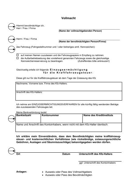 Vollmacht Sepa Kfz Steuer Einzugsermachtigung Hamburg. Eine kennzeichenreservierung ist für alle fahrzeugarten möglich. Für kennzeichen aus dem zulassungsbezirk worms. Auf wunsch im anschluss kennzeichen bequem bestellen. Lesen sie, wie die vollmacht erteilt wird. Bevollmächtigte benötigen zusätzlich eine vollmacht, den eigenen personalausweis und zumindest eine kopie des personalausweises. Die kosten für die reservierung und ausstellung eines wunschkennzeichens sind bundesweit einheitlich. Die vollmacht für kurzzeitkennzeichen bietet den komfort, entsprechende kennzeichen durch dritte abzuholen. Wir sind bundesweit zertifiziert und in. Externe kennzeichen sollten bei der kennzeichenführenden behörde reserviert werden. Wir reservieren ihr wunschkennzeichen direkt bei ihrer zuständigen zulassungsstelle. Diese bringen sie bitte zusammen mit der bestätigung ihrer kennzeichenreservierung bei der zulassung mit. Andere angebote zur kennzeichenreservierung im internet. Dabei sind name und anschrift anzugeben. Die kennzeichenreservierung ist ausschließlich auf den namen des zukünftigen fahrzeughalters möglich. Unser reservierungsservice führt die reservierung in ihrem namen bei der zulassungsstelle durch.